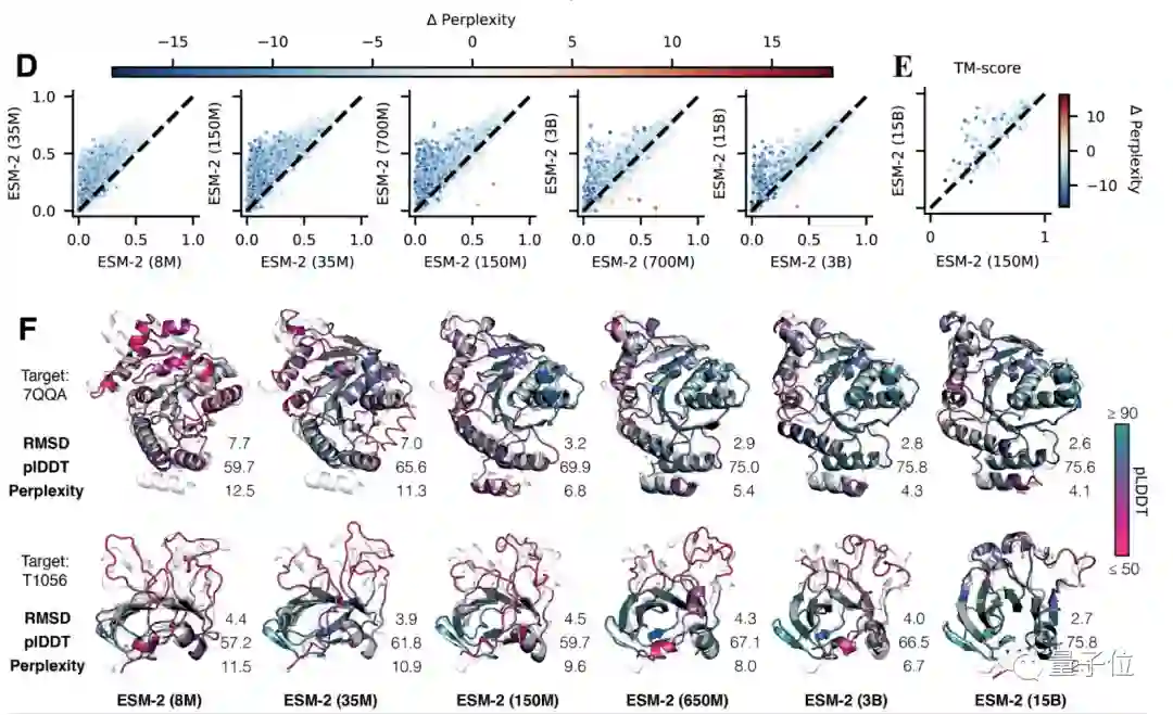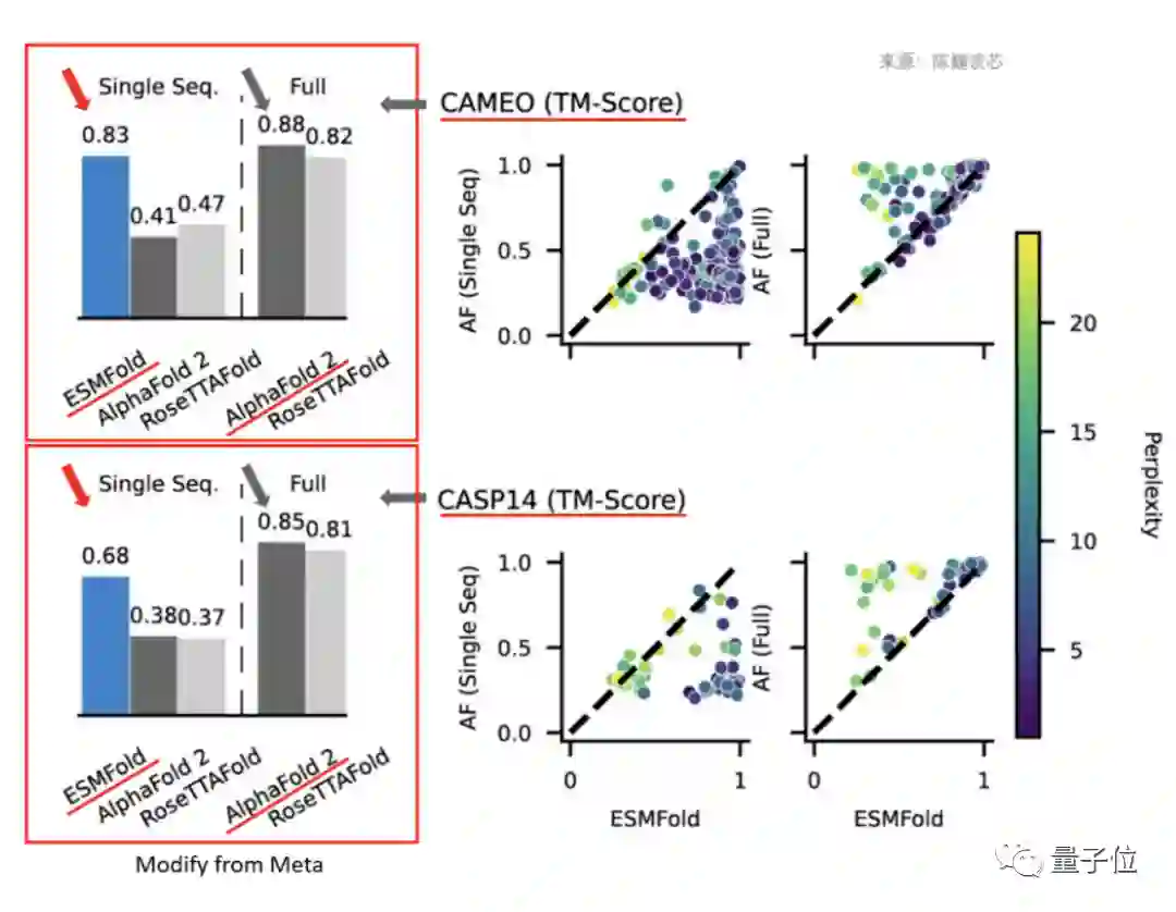 通过这个150亿参数的ESM2,ESMFold只用一个序列作为输入,就能有效预测端到端的3D结构;而AlphaFold2则需要多序列输入才能有良好表现。