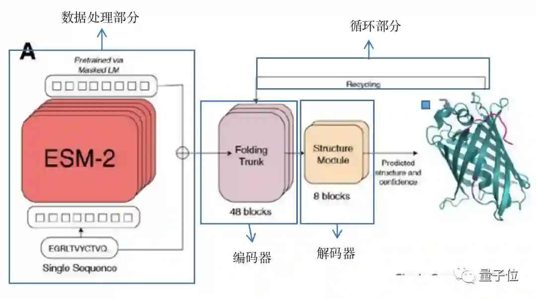 基于语言模型的开发出来的ESMFold,主体结构其实和AlphaFold2有不少相似之处——
