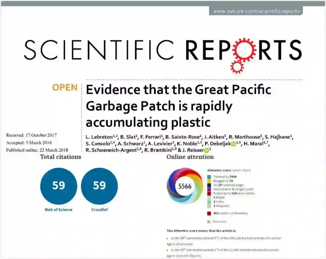 Laurent Lebreton与团队对北太平洋亚热带水域漂浮塑料进行了的为期三年的实地考察,包括一次多船航海勘探和一次空中侦察。他们的研究对臭名昭著的太平洋垃圾区中的海洋垃圾进行全面的量化分析和表征归纳,并发表在Scientific Reports 上,位列2018年Altmetric最受全球媒体关注的论文第7名。