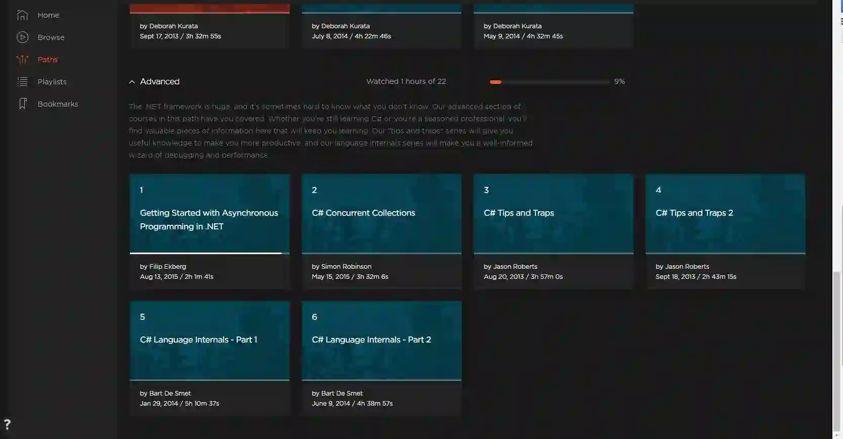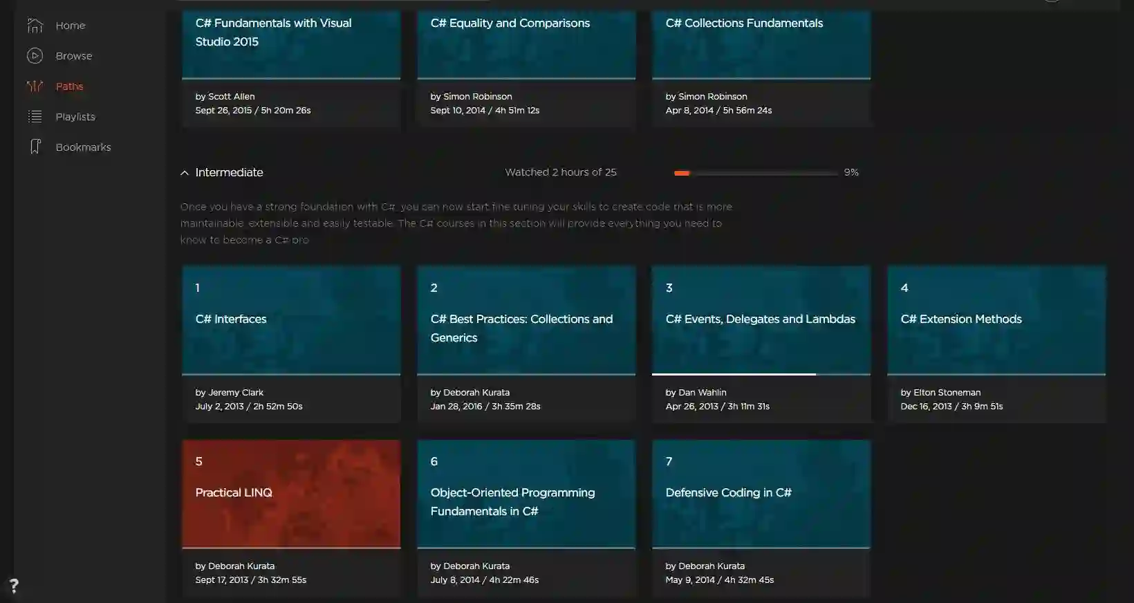 Pluralsight:全部都是技术类教学视频。有些视频出自大牛,例如 Jon Skeet。部分视频带有英文字幕。视频内容翔实丰富,且十分与时俱进,在 ASP.NET Core 出来仅仅一个星期,就有了关于它的教学视频。最近网站改版,对于某些话题还添加了学习之路功能,例如以下的视频是关于 C#的学习之路,分为简单,中等和高级。