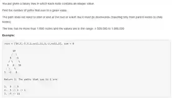 题目的意思是给定一个二叉树,让我们找到路径节点和等于给定值的路径的个数。这里的路径不一定是从根节点到叶子节点,可以是其中的一段,但是必须是自上而下的顺序。