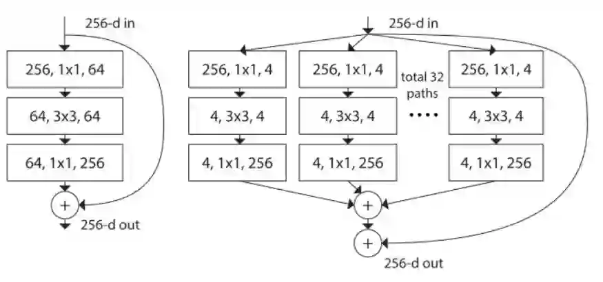 左图:ResNet 模块;右图:有大致一样的参数复杂度的 RexNeXt 模块