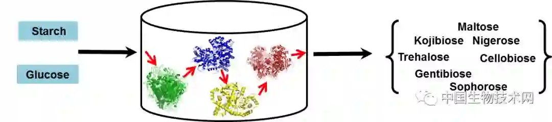 中国科学院天津工业生物技术研究所研究员游淳带领的体外合成生物学中心研究团队,设计了将廉价底物淀粉和葡萄糖一步转化为昆布二糖的体外多酶催化系统。该体系包括α-葡聚糖磷酸化酶(α-glucan phosphorylase, αGP)和昆布二糖磷酸化酶(laminaribiose phosphorylase, LBP),其中αGP将淀粉转化成高能磷酸化糖(葡萄糖1-磷酸,G1P),LBP将葡萄糖和G1P催化合成昆布二糖;此外,添加异淀粉酶(isoamylase,IA)和4-葡聚糖转移酶(4-glucanotransferase,4GT)两个辅助酶可以提高昆布二糖产率;最终通过反应体系优化,基于淀粉的昆布二糖的产率进一步提高至91.9%。为验证该反应路径的工业潜力,该研究团队提高了底物淀粉和葡萄糖的浓度,最终可以得到61.2 g/L昆布二糖。这条新的酶法制备二糖系统可以成为未来二糖的生产平台,通过替换糖苷磷酸化酶可以合成不同二糖,为以淀粉为底物生产其他二糖奠定了基础。