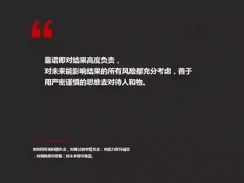 我理解的靠谱是:对结果高度负责,对未来能影响结果的所有风险都考虑充分,善于用严密谨慎的思维去解决遇到的问题。
