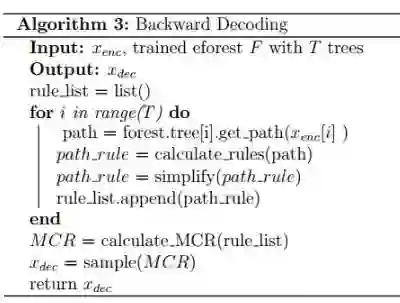 现在,我们可以总结 eForest 的后向解码过程。具体来说,给定一个已训练的森林和特定数据在 R^T 中前向编码的 x_enc,后向解码将首先通过 x_enc 中的每个元素定位独立的叶结点,然后获得对应决策路径的 T 个决策规则。随后通过计算 MCR(Maximal-Compatible Rule),我们能从 x_enc 反推回输入空间中的 x_dec,因此也就得到了重构。后向解码的伪代码如下所示: