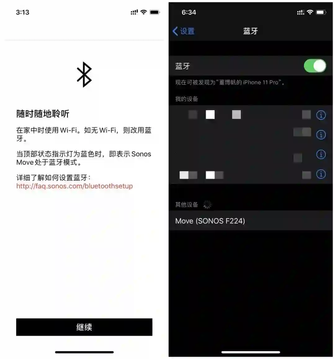 如果我需要切换到蓝牙模式,只需按一下蓝牙 / Wi-Fi 切换按钮,Sonos Move 顶部面板的状态指示灯就会闪烁蓝色,这时候就可以在终端设备的蓝牙设置里找到 Sonos Move 了,配对后即可使用任意流媒体 App 播放音乐。