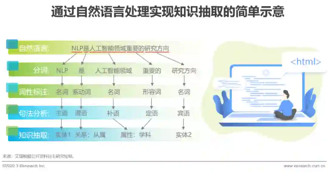 自然语言处理(NLP)是一门涉及语言学、数学和计算机科学的综合学科,主要研究人与计算机之间使用人类自然语言进行有效沟通的理论和方法。NLP技术包含非常广泛,最常应用于知识图谱中的能力是对于自然语言中信息的抽取,基本能力包括分词、词性标注和句法分析,通过词典法或统计法将文章中的词语进行分割,由最大熵、HMM或CRF等算法训练模型,对名词、动词、形容词、标点符号等词性类别进行识别和标注,再根据规则法或统计法对语句的主谓宾等句法结构进行分析,得到完整句式,最终产出一个计算机可识别的语料库,供后续需求调取。NLP技术是人工智能领域最具有挑战性的任务之一,2018年10月,谷歌公布的BERT模型在11项NLP任务中表现卓越,将下游具体NLP任务近一步推向预训练产生词向量环节,增强了NLP的泛化能力和自动化能力,为业界带来了新的思考方向,随着训练模型的不断探索与开源,类似深度神经网络于识别类任务的里程碑型训练算法终将出现,届时NLP训练成本将大大降低,从而真正走向产业化,开启认知智能的大门。