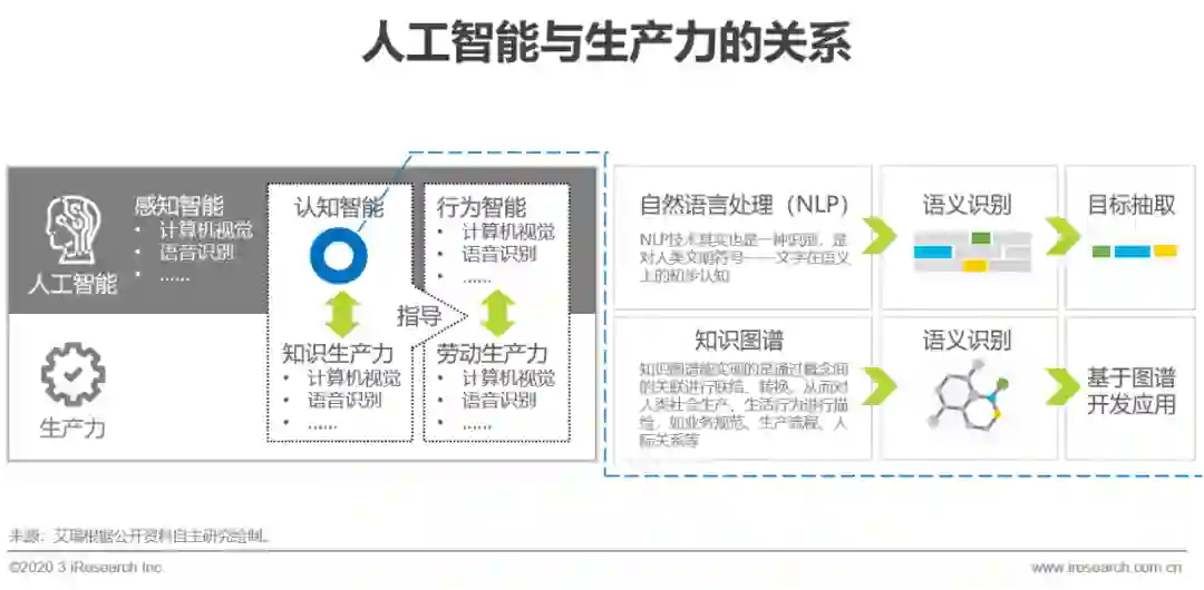 人工智能本质是解决生产力升级的问题,人类生产力可以归类为知识生产力和劳动生产力,人工智能走入产业后,可以分为感知智能、认知智能和行为智能,后两者更与生产力相对应,NLP和知识图谱是发展认知智能的基础。