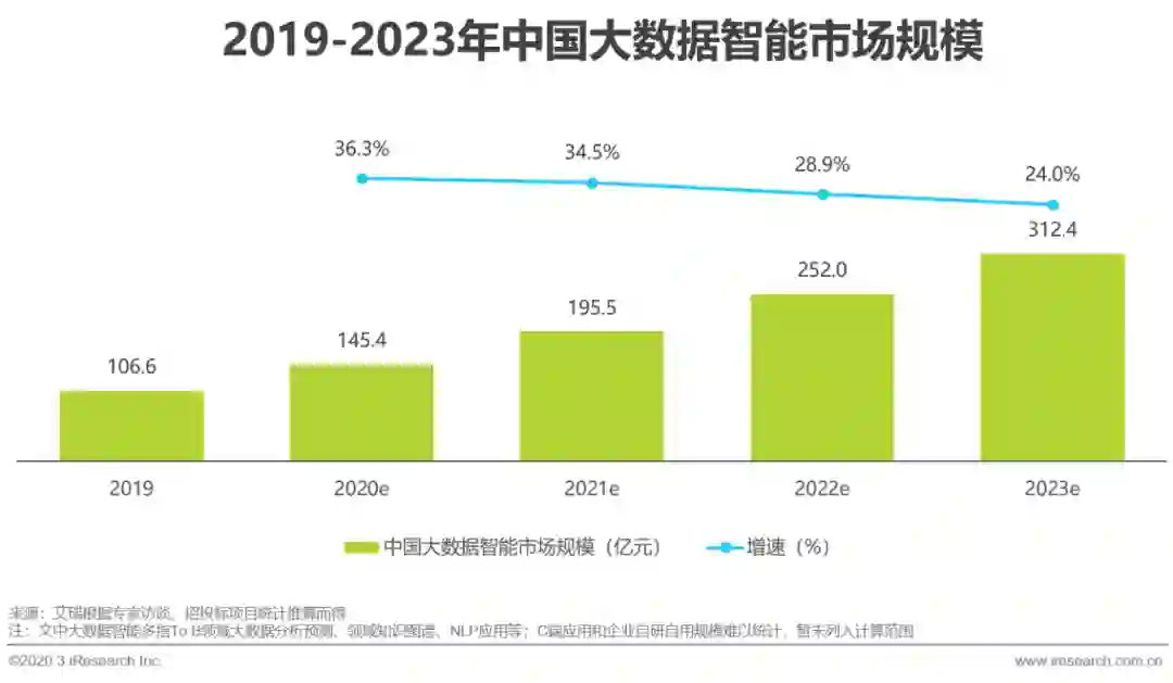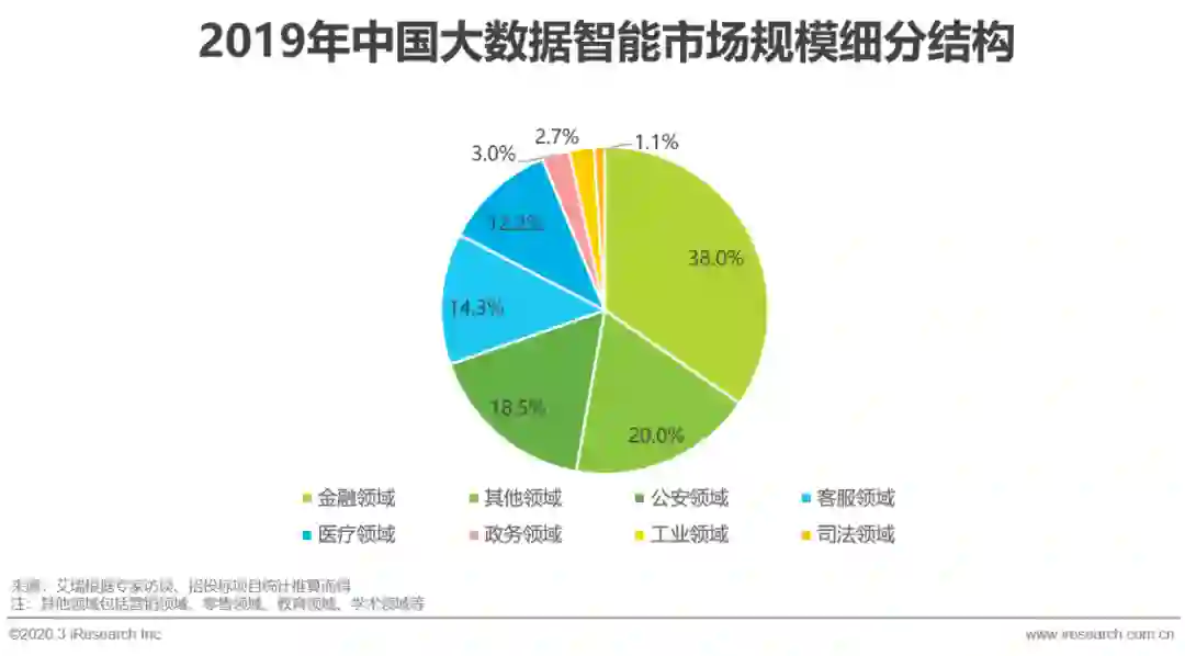 据艾瑞咨询统计推算,2019年涵盖大数据分析预测、领域知识图谱及NLP应用的大数据智能市场规模约为106.6亿元,预计2023年将突破300亿元,年复合增长率为30.8%,其中2019年市场中以金融领域和公安领域应用份额占比最大,金融领域因标准化数据积累丰富,行业认知与直接需求最为明显等因素,成为数据智能最早落地并产生价值的行业;公安领域经过三年的感知智能基础设施建设,已经初步形成人工智能应用环境,在党中央和公安部的号召指导下,公安大数据建设将成为下一阶段的主题,这一趋势也在2019年相关招标项目中得以体现。随着整体市场数据基础的完善和需求唤醒,大数据智能领域规模持续走高,但在行业可落地性和理性建设的限制下,预计市场增速将呈现下降趋势,期间咨询性需求将会大量出现,从整体发展来看增速处于良性区间,对真正有价值的公司和产品有正向意义。