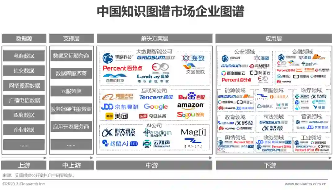 中游解决方案提供方进行全流程服务,是产业链核心环节,中国知识图谱市场产业链上游主要以各类数据源企业或机构为主,因所处理数据多具有敏感性和专属性,所以往往数据源也是服务的需求方;中上游主要包括数据采集服务商、数据库服务商、云服务商等,为产业链做支撑服务,但涉及保密数据采集加工的业务更多交由解决方案提供方直接处理;中游主要以提供知识图谱解决方案的大数据智能公司、互联网公司和AI公司为主,该部分是产业链的核心环节。其中大数据智能公司多脱身于大数据公司,凭借多年数据服务积累,在具体领域中具有先发优势和工程落地经验,随着市场对于认知智能需求的觉醒,近些年越来越多的大数据公司开始向知识图谱做技术拓展。互联网公司多以巨头企业为主,因其综合服务能力强、具有生态优势等因素,在资源调动和承接整体解决方案方面具有优势。AI公司主要以机器学习能力、NLP能力切入知识图谱市场,在技术创新和算法应用开发方面具有优势;下游为基于知识图谱而开发应用的各类具体场景应用,知识图谱应用在中国刚刚起步,主要聚焦于图中展示领域,随着市场推进将辐射更多行业。