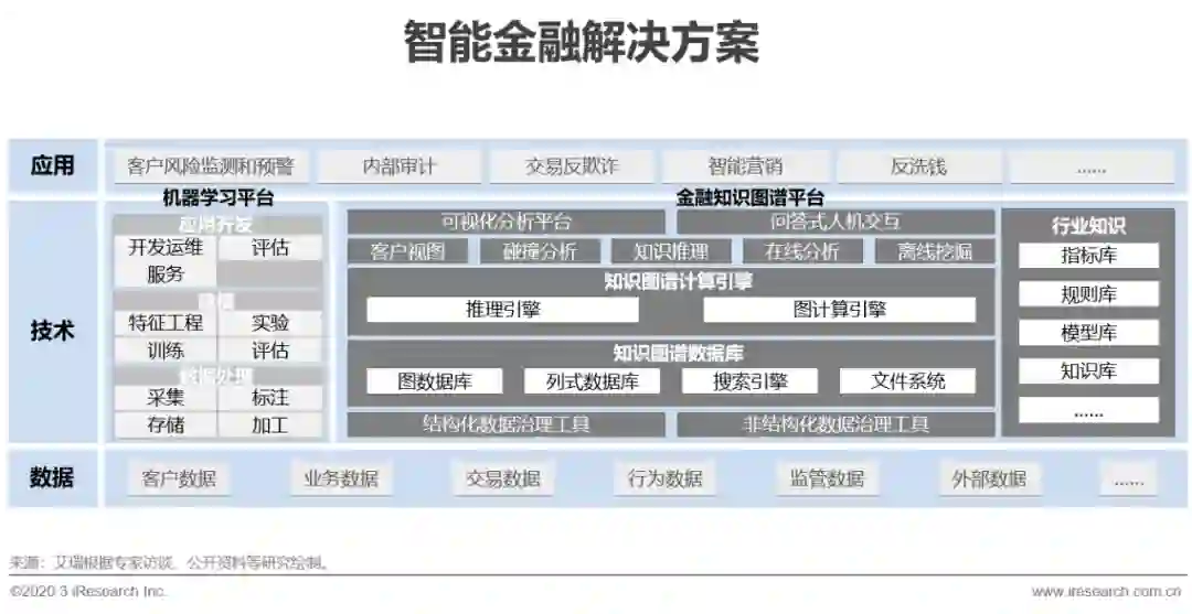 在金融领域中无论是传统金融或是互联网金融,信用评估、反欺诈和风险控制都是最为关键的环节,随着近些年金融数据的爆发式增长,传统风控系统逐渐力有不逮,而应用机器学习算法和知识图谱的智能风控系统在风险识别能力和大规模运算方面具有突出优势,逐渐成为金融领域风控反欺诈的主要手段。机器学习和知识图谱相结合是目前主流的解决方案,其中机器学习算法通过概率计算的方式,以数学运算特征反应风险情况,形成易于机器计算的风控模型;而知识图谱通过权威经验和规则创建本体模型和抽取实体的范围,根据实体间关系形成关联数据网的图谱形式,描画囊括个人基础信息、金融行为、社交网络行为等用户综合画像,根据画像情况和模型对应,形成具有金融业务特性的风控体系,在解决方案的决策环节结合规则和概率的综合评价,给出最终的风险评估,整个过程能够实现秒级响应。知识图谱的应用不仅能够为缺乏可解释性的机器学习算法带来必要的参考系,还可以串联金融业务中产生的大量多源异构数据形成数据中台,挖掘数据深层价值,为实现精准营销、投资关系梳理、产业链风险预警、智能催收等上层应用打下基础。