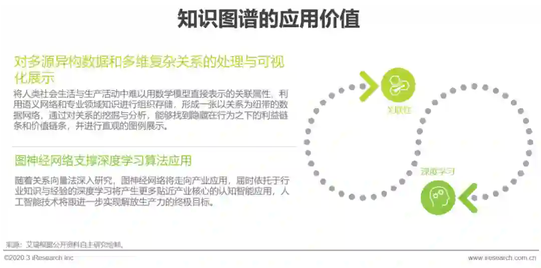 知识图谱是人工智能符号学派中知识工程的代表应用,其核心价值在于对多源异构数据和多维复杂关系的处理与可视化展示,其底层逻辑是将人类社会生活与生产活动中难以用数学模型直接表示的关联属性,利用语义网络和专业领域知识进行组织存储,形成一张以关系为纽带的数据网络,通过对关系的挖掘与分析,能够找到隐藏在行为之下的利益链条和价值链条,并进行直观的图例展示。在面对数据多样、复杂,孤岛化,且单一数据价值不高的应用场景时,存在关系深度搜索、规范业务流程、规则和经验性预测等需求,使用知识图谱解决方案将带来最佳的应用价值。连接主义中的深度学习算法几乎代表了当代整个人工智能技术,但深度学习需要具有明确因果关系的数据对训练,且存在尚缺乏解释性的黑箱问题,在掺杂众多非线性问题的复杂场景中应用价值有限,通过与知识图谱的配合使用,在一定程度上可以解决此类问题,随着关系向量法深入研究,图神经网络将走向产业应用,届时依托于行业知识与经验的深度学习将产生更多贴近产业核心的认知智能应用,人工智能技术也将跟进一步实现生产力升级的终极目标。