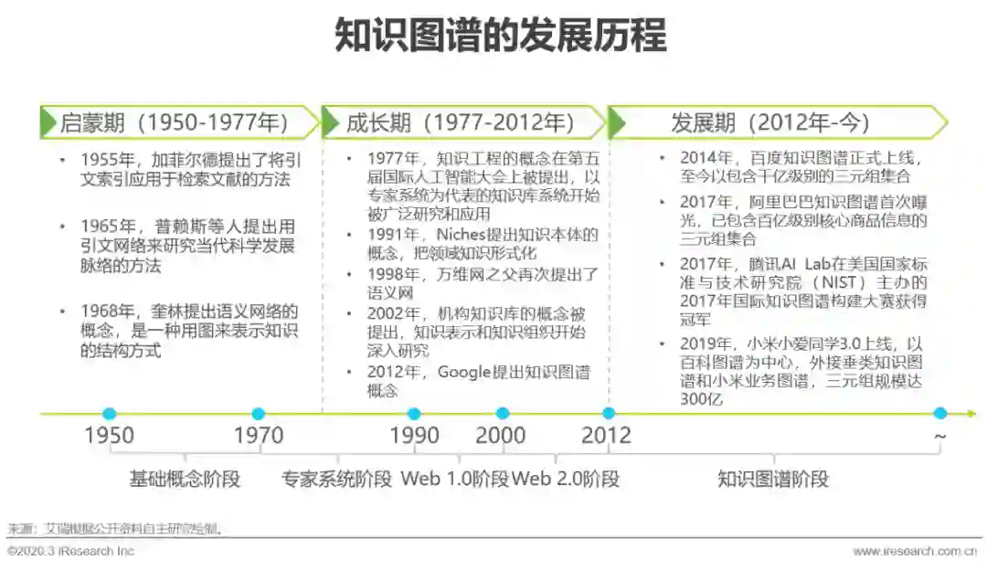 知识图谱发展至今可以总结为三个时期和五个阶段。1950-1977年是启蒙期,包含了基础概念阶段和专家系统阶段的开端,这一时期文献索引的符号逻辑被提出并且应用;1977-2012年是知识图谱不断演变的成长期,包含了大部分专家系统阶段和Web 1.0和2.0阶段,在此期间出现了很多如WordNet、Cyc、Hownet等大规模的人工知识库,知识工程成为了人工智能重要的研究领域,2012年,Google正式提出的知识图谱概念,开启了现代知识图谱的序章;2012年至今是知识图谱的发展期,中国企业开始入局,以BAT为代表的科技公司依托自身业务,在搜索引擎、电商、医疗等领域开始应用知识图谱技术,解决办法服务商们也从大数据赛道中脱颖而出,将知识图谱技术拓展到安防、金融、教育等更多领域,让AI跳出感知智能的商业局限,向解决各产业生产环节中的核心痛点更进一步。