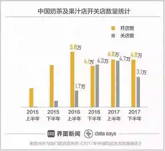 “优胜劣汰”的商业现实,在奶茶这个行业表现得更为残酷。《2017年中国饮品生态发展报告》显示,虽然2017年奶茶果汁店全年开店数达到9.6万家,但是也有7.8万家关门,一些无法形成规模与品牌优势的奶茶店几乎已经被淘汰。