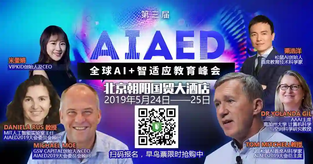 5月24-25日,乂学教育-松鼠AI将联合中国自动化学会、IEEE教育工程和自适应教育标准工作组、新东方、好未来、36氪等机构在北京国贸大酒店举办AIAED全球AI智适应教育峰会,活动邀请了包括机器学习教父、CMU计算机学院院长Tom Mitchell教授,MIT人工智能实验室主任Daniela Rus教授,苹果公司副总裁John Couch,VIPKID创始人米雯娟、乂学教育-松鼠AI创始人栗浩洋,伦敦大学教授、国际顶尖AI教育学术大会AIED主席Rose Luckin教授,ASU-GSV教育大会联合创始人、GSV资本创始人Michael Moe等国内外产学研专家学者与商业领袖,共同分享“人工智能+教育”领域发展的新机遇,探讨建立基于人工智能的教育新秩序的可能。欢迎大家届时前来参加!