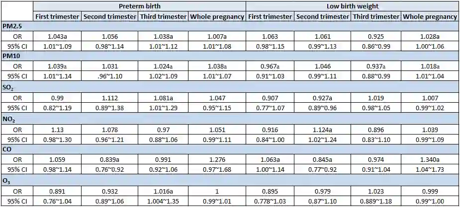 表1.妊娠暴露于空气污染与早产/低出生体重的关系