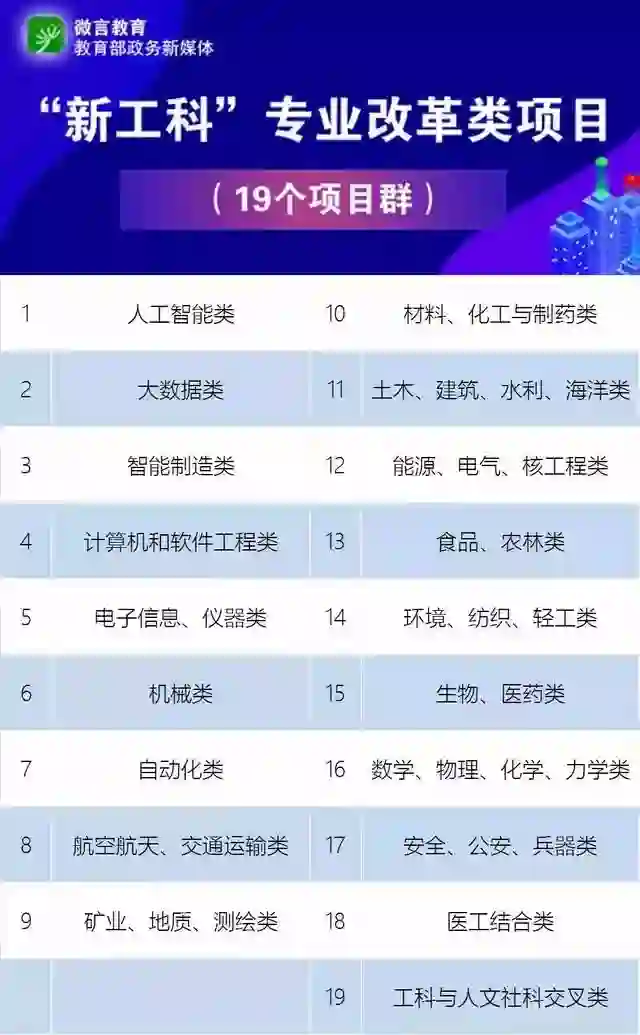 此次公布的首批“新工科”研究与实践项目名单,包括了202个“新工科”综合改革类项目和410个“新工科”专业改革类项目。其中,“新工科”专业改革类涵盖了包括人工智能类、大数据类、智能制造类等热门“新工科”在内的19个项目群。