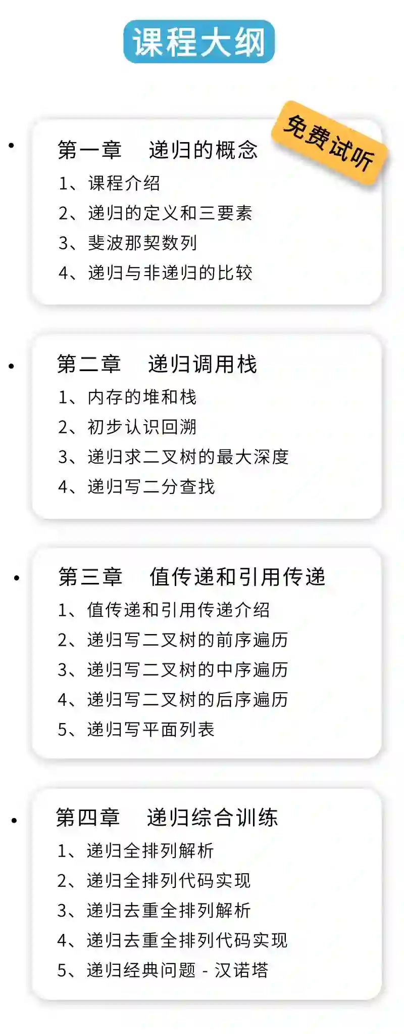 (免费试听内容包括:课程介绍、递归定义、递归三要素、斐波那契数列、递归与非递归区别)