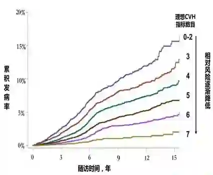 横轴:随访时间(年),纵轴:累积发病率。CVH,cardiovascular health,心血管健康。该图表示:随访时间相同时,理想CVH指标数目越多的群体,动脉粥样硬化性心血管病的累积发病率越低;说明随着理想CVH指标数目的增加,发生动脉粥样硬化性心血管病的相对风险逐渐降低。