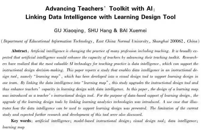 人工智能作为当今最先进的智能技术之一,正在以其前所未有的方式改变着诸多行业。人工智能技术虽然在可预见的将来不会取代教师这一职位,但智能技术能为教师增能已逐渐被人接受。近年来,研究者认识到,对于教学实践来说,最有价值的智能技术是数据智能,即学习分析技术所关注的数据支持的教学决策。延续本团队在教学设计工具以及学习分析技术方面的研究,本文对“学习地图”这一教学设计工具加以数据智能的拓展。文章首先从基于模型的教学设计工具的角度,对学习地图这一教师工具进行分析;然后从利用学习分析工具提供数据支持的学习改进角度,提出挖掘数据智能以便为教学设计增能的可能性及其设计,以期为智能时代的教师工具提供开发思路。