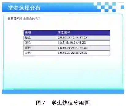 互动问答生成合作探究主题。在课程进行过程中,教师为了更好地开展合作探究活动,需要根据学生的认知水平对其进行分组。教师可根据学生的兴趣点作为分组的依据,从而更好地促进他们参与到合作中。本案例中,学生对“创造你的彩光”的互动回答,让教师及时掌握学生的兴趣所在,并根据他们的选择快速对其进行分组(见图7)。