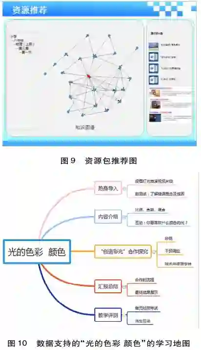 概念转变路径带来个性化资源推荐。学习地图后台中的学习分析工具利用最终的教学评测数据以及过程性数据分析,对学生的概念转变路径进行绘制,帮助学生确定学习的规律和模式。本案例中,运用后台系统的行为模式分析模型,绘制学生概念学习的过程性数据,最终获得“光的色彩颜色”这一知识的概念转变路径(见图8)。同时通过可视化的技术方式为教师和学生呈现,并根据协同过滤、决策树等算法为师生推荐个性化的学习资源包(见图9)。本案例中学生的概念转变行为模式中“互动交流”与“形成认知冲突”尤为关键,因此教师可以在教学设计时根据这一模式特征,为学生创设更加真实的学习情境,激发认知冲突,同时参与到学生的交流互动之中,引导并鼓励他们的参与行为,为教师提供更具针对性的个性化资源。