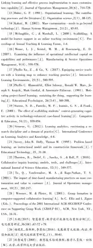 定制代表了一种新的生产范式,其目标是产品的个性化增值效益与标准化生产的成本效益相结合。随着定制概念的普及,越来越多的定制方案被提出,主要体现在产品的设计与流程的变化(Feltzinger et al.,1997;Tu et al.,2001)。遵循定制模式进行设计,意味着面临教学环境的更多不确定因素。这也使越来越多的研究强调关注知识和学习在适应不断变化的环境中的作用(Menor et al.,2007)。然而,学习是复杂而艰巨的。特别是涉及隐性知识时,潜在的模糊的因果关系可能会妨碍学习的有效性(Huang et al.,2008)。只有学习的有效性在学习过程中反映出来,才能体现出定制机制的强大能力(Huang et al.,2008)。如果学习的设计过程不伴随行动而变化,学习的绩效也得不到提升(Huber,1991)。由学习创造的知识必须转化为过程的能力,实现其在过程改进中的潜力(Garvin,1993)。因此,人们需要从过程实施的角度出发,寻求能够提升定制效率的有力抓手。为满足学习定制的需求,学习地图2.0版将焦点放在过程性数据的收集与分析上,为教师的生成教学设计方案提供数据及分析支持,使教学设计的过程性表征成为定制成效发生的现场。