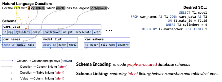 模式编码是指如何编码数据库信息,因为数据库由多个主外键相连的表格构建而成,它本身是一个图的结构,如何编码这种图结构对算法提出了比较大的挑战。模式链接是指用户的问题中有一些词或显式或隐式地提到数据库模式,比如这里的cars就关系到表名cars_data和列cars_name。如何把问题和数据库模式的这种关系让模型感知到就是模型设计的另一个关键。