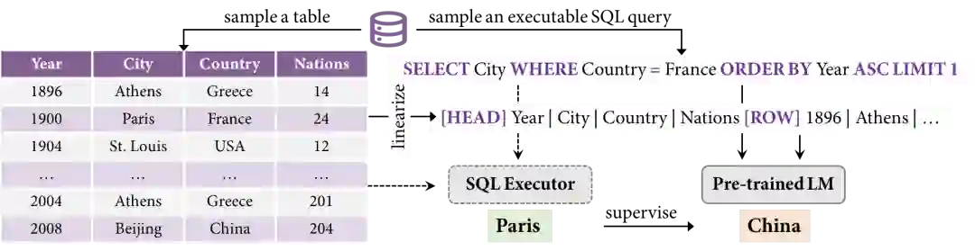 刘乾: 不同于上两个预训练模型最终的应用场景是输出SQL,TAPEX [21]的目标是增强模型在弱监督场景下的性能。它的下游模型在接受自然语言问题和表格作为输入后,直接输出其对应的答案。因此呢,TAPEX 提出的目的就在于提升下游模型在理解表格结构以及在表格上进行推理的能力。那如何增强下游模型对表格的推理能力呢,TAPEX给出的答案是:让模型去模仿学习一个SQL执行器的行为。如果一个神经网络都能学会执行如此复杂的SQL,并给出它正确的执行结果,那我们可以预期它对表格的结构也好,在表格上的推理能力都应是相当强的。TAPEX的实验也验证了,就只需要在这种SQL和其执行结果的纯合成的数据上做预训练,TAPEX也能在四个不同的数据集上都获得最好的性能。