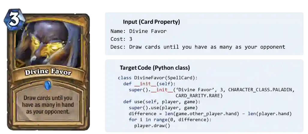 殷鹏程: 刚刚两位讲到了如何将自然语言转换成SQL语句这种领域相关的代码(Domain-Specific Language, DSL),其实语义解析还可以用在更广泛的范畴,比如说通用的代码生成(Code)。在代码生成领域,第一项工作是由DeepMind于2016年发布的HeartStone数据集[3]。在这个数据集的设定下,系统所接受的自然语言的输入并不是一个用户提交的问题,而是一组关于炉石传说卡牌的描述,系统的目标就是生成一串能够实现这个卡牌的代码。一个包含输入、输出的示例如下图:
