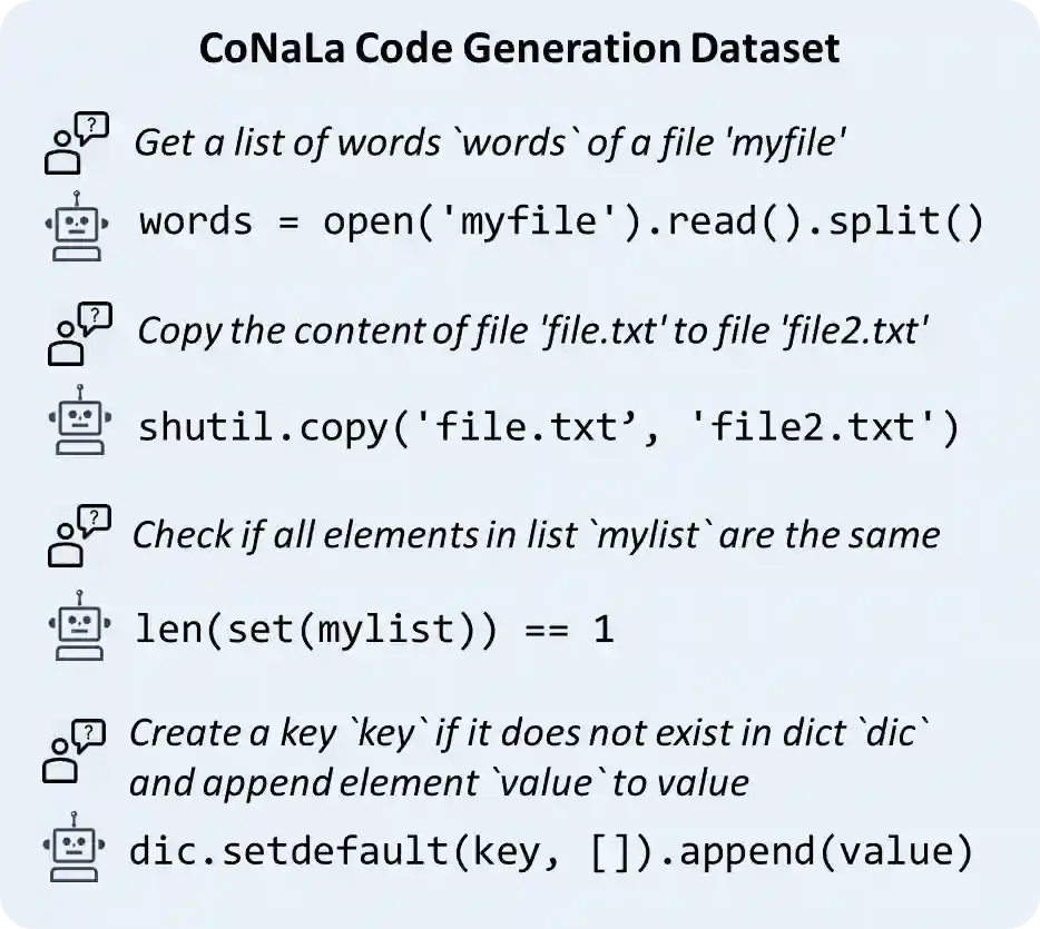 其实呢,除了炉石传说这种特定领域下的代码生成,我们还可以考虑开放领域下的代码生成。下图是CoNaLa数据集,是由我们团队在2018年构建的[4],它的目标是能够自动化地把一个程序员的自然语言问题变成相应的Python代码实现。这个数据集是源自一些知名的编程问答平台(如StackoverFlow)上网友提问的问题,和其他网友贡献的一些Python实现。但是,想从这样的平台上自动抽取干净的平行语料还是比较困难的,我们团队当时构建了一个模型来自动地抽取这样的数据对。有了这些数据对后,我们邀请一些程序员对这些数据对进行进一步的过滤和修正,最终就可以得到CoNaLa这个数据集。