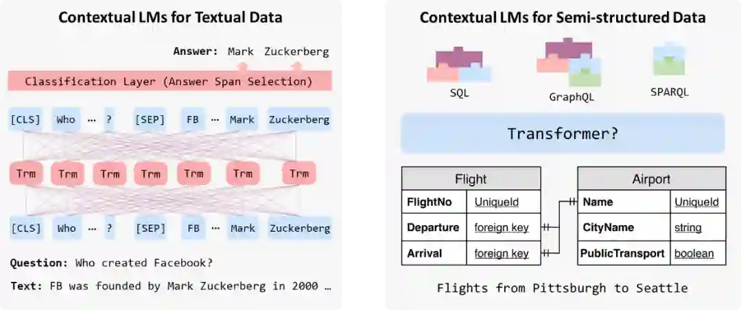 殷鹏程: 正如我们之前所提到的,语义解析任务需要很多的领域知识,例如程序相关的语法结构。而在领域知识中,另一块比较重要的其实就是表格 (例如text-to-SQL里需要把表格作为输入的一部分)。目前主流的语义解析中的预训练模型都是与表格相关的。下图对比展示了传统的针对文本数据的预训练(左侧)和针对表格数据的预训练(右侧)。传统的文本预训练模型在阅读理解任务中应用时需要利用Transformer来理解问题 Who created Facebook,并在相应的领域知识——非结构化文档上进行推理得到最终的答案;针对表格的预训练模型在语义解析任务中应用时同样需要学会理解问题如 Flights from Pittsburgh to Seattle,但它的领域知识变成了结构化的数据表,最终输出的是编程语言如SQL, GraphQL 等。同样地,针对表格的预训练同样需要用Transformer来编码,编码过程主要有两大难点: (1) 如何用 Transformer编码结构化的表格;(2) 如何设计一个通用的预训练模型,使得其可以兼容不同的编程语言。