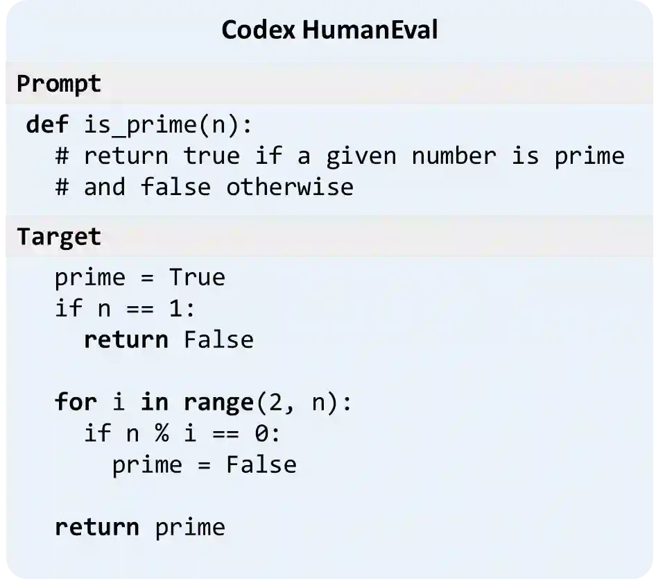 除了这种简短的代码外,近些年也有如Github Copilot 这样的能够生成较为复杂程序的技术。Copilot背后的技术就是OpenAI最近提出的CodeX [5],一个基于代码的预训练模型。CodeX系统的输入是一段提示(Prompt),比方说下图中的提示输入到CodeX中,它可以生成一个判断输入数字是否为质数的Python程序。