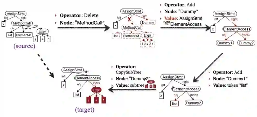 姚子瑜: 除了可以通过交互让系统更了解用户意图,系统其实还可以更通用地支持用户对已经生成的程序进行简单的编辑,从而在之前的程序的基础上更快地表达用户意图。下图给出了一个例子,其中源程序(source program)是待编辑的程序,目标程序(target program)是编辑后的程序。在 [23] 这个工作中,我们探索了能否设计一个通用的模型来完成程序的编辑操作。我们所提出的模型直接在程序对应的树结构上做编辑操作,在每个动作时要确定若干信息:(1) 编辑类型 (Delete/Add);(2) 编辑结点 (Node);以及可能的额外内容如新增的值 (Value)。