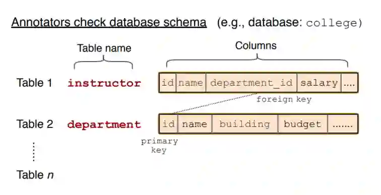 王柏林: 语义解析最常见的一个应用场景就是数据库的自然语言接口(Natural Language Interface for Database, 又名 NLIDB)。一个主要的原因是数据库我们平时应用比较多,许多应用都是通过数据库来存储数据的,而用户和开发者也都需要与数据库的频繁交互来查询数据。在这个方向上,最近受大家关注度比较多的就是 Spider这个数据集 [1]。它的创建过程是这样的:首先收集一些数据库,每个数据库里可能包含很多表格,比如下图中的 instructor 和 department。