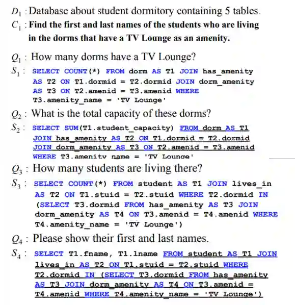 王柏林: 面向数据库的对话式语义解析相比传统的对话而言泛化性要更强一些,也更关注于数据库的交互。与传统任务型对话动机一样,当用户与数据库交互时,很多情况下都需要多轮交互才能达到最终的目的。下图的例子展示了数据集 SParC [9] 中一个关于学生宿舍数据库上的一个比较复杂的问句 C1。大家可以看到,这个问句非常复杂,用户一般其实也不会这么去提问。更自然的一种交互方式其实是用户通过一组对话比如 Q1, Q2 等一起来完成一个复杂询问的操作。