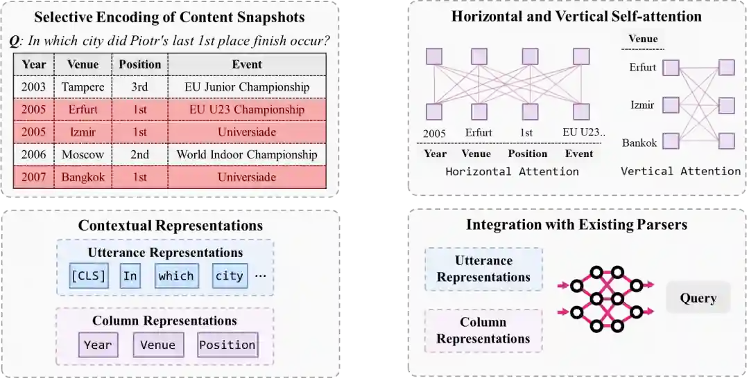 殷鹏程: 针对以上问题,我们提出了一个可以增强表格理解的预训练语言模型TaBERT [18]。该模型设计的主要一个出发点在于,现实生活中表格会非常长,比如商用系统中的数据表可能有成千上万行。所以,第一步要先做一个数据精简,即下图中的选择编码(Selection Encoding)。以下图中的问题为例,当用户提问 In which city did Piot’s last 1st place finish occur? TaBERT首先会选几个与问题相关的行(下图红色所示),然后只需要编码它们即可。有了精简的表格后,接下来的一个关键问题在于,如何修改Transformer从而让它能够理解结构化的表格知识。TaBERT通过扩展传统的自注意力(Self Attention),让模型既能注意到水平方向的其他格,也可以注意到垂直方向的其他格的内容。TaBERT最终的输出不仅包括了用户问题的表示,还包括了表格中的每个表头的表示。这些表示可以被下游的语义解析模型用到,从而解码得到对应的编程语言。