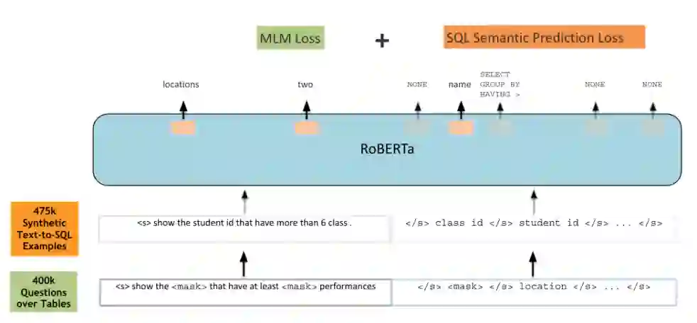 王柏林: GraPPa[19] 跟TaBERT的动机是一样的,就是如何利用大规模的预训练数据来通用地向语义解析模型注入领域知识。但是不同于TaBERT在网上爬取大规模的数据,GraPPa的核心思想是利用现有数据集里的模板系统性地构造大规模的数据。其构造数据的核心思想借鉴于论文[20],即通过同步上下文无关文法(SCFG)来合成新的自然语言和编程语言的成对数据。GraPPa首先通过现有的数据集人工归纳出SCFG文法,接着将这些SCFG应用在新的编程语言上,从而得到可能有噪音的(自然语言,编程语言)的成对数据。最终,搭配合适的预训练目标,GraPPa可以普遍地增强text-to-SQL模型的性能。预训练用到的训练模板除了传统的掩码自然语言目标(Masked Language Model, MLM) 外,还引入了SQL语义预测目标(SQL Semantic Prediction)。前者就是利用自然语言上下文去预测当前被[MASK]掉的词对应的原文中的词,而后者是去预测这个自然语言对应的SQL的操作符有哪些。