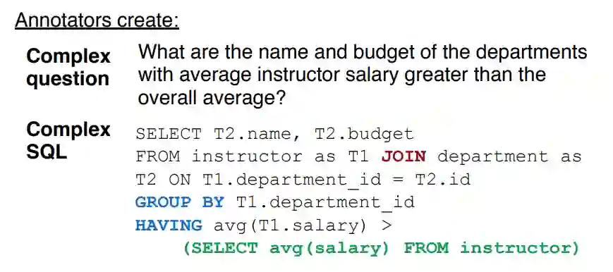 标注者被要求想出一个复杂的问句,同时要标注出跟这个问句对应的SQL语句,如下图所示: