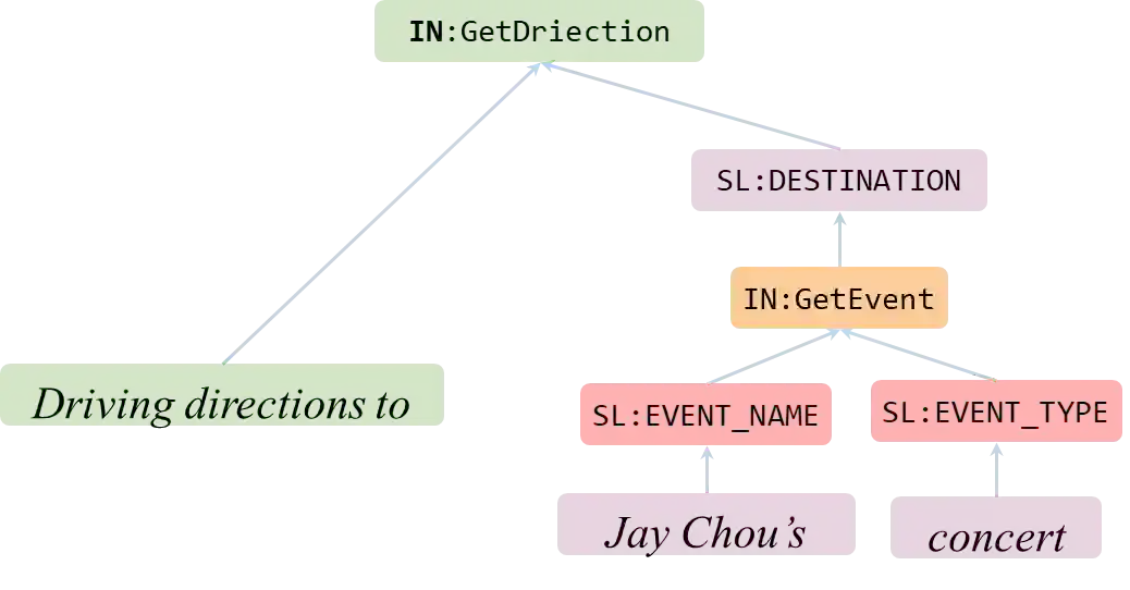 殷鹏程: 随着任务型对话需求的复杂程序逐渐提升,使用语义解析方法来解决传统的任务型对话是一种趋势。在这个方向上,首先我想介绍一下Facebook所提出数据集TOP [7],它的任务要求模型能够层次(Hierarchical)化地理解自然语言,这种层次化理解的难度我认为介于槽位填充(Slot Filling)方法与语义解析方法之间。下图是一个TOP中的示例,它通过定义一种层次化的表示来支持嵌套查询等复杂操作。