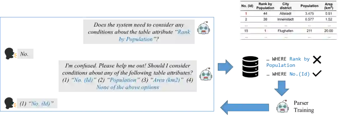 姚子瑜: 当用户问的问题里有歧义时,或者系统不理解用户的问题时,我们希望系统能够主动地提出一些澄清式问题以从用户的反馈中学习。如下图所示,当系统不理解用户提出的问题时,可以通过用户的反馈(比如做下图的多选题)来告诉系统在这种提问下应该如何决策。在我们的工作中 [22],我们实现了刚才所描述的系统,期望系统在部署后可以通过与用户源源不断的交互来持续提高在编程语言生成的能力。同时这种系统还可以在线上收集更多平行语料。