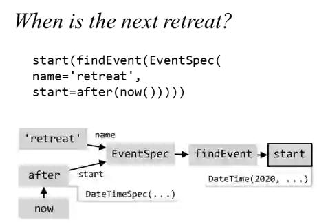 姚子瑜:如上位嘉宾所说的,当任务型对话复杂到一定程度后,解决方案最终其实会收敛到语义解析的方法。例如,去年微软Semantic Machines 团队就发布了一个数据集 SMCalFlow [8],将语义解析方法直接用在了任务型对话中。下图展示了该数据集中的一个示例,大家可以看到相比TOP而言,这个数据集中的代码要更加复杂。而这种代码设计的主要动机在于更好地处理用户自然语言中组合式(Compositional)的语义。