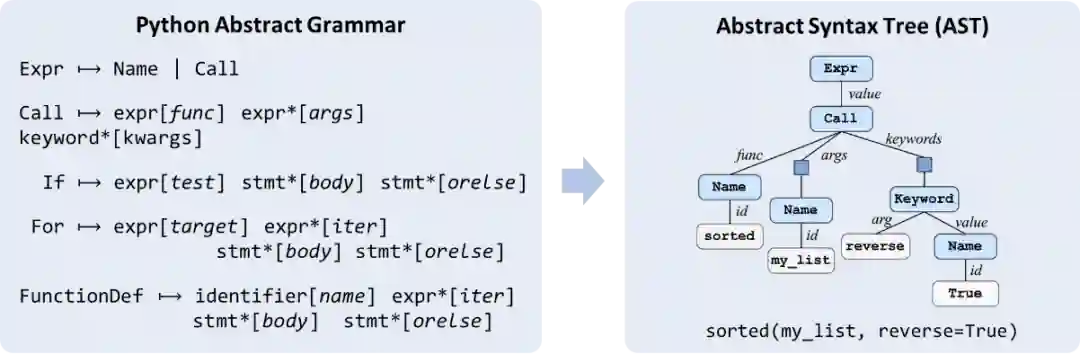 殷鹏程: 语义解析领域下其实囊括了许多不同的任务,如NL-to-SQL, NL-to-Python等。不同任务其实需要不同的领域知识(Domain-specific Knowledge),其中很重要的一种知识就是生成代码本身要遵从的对应语法(Grammar)。下图右侧是一段Python代码和它所对应的抽象语法树(Abstract Syntax Tree),左侧则是Python的语法。不难看出,Python的语法中其实蕴涵了许多对模型输出空间的约束,例如,一个Expr (即表达式)只能展开成一个 Name (即变量名) 或者一个 Call (即函数调用)。