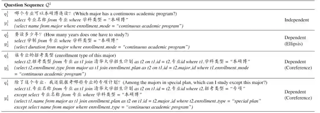 例如,在SParC数据集中,第1轮问句对应的SQL往往非常简单,而最后1轮问句对应的SQL往往非常复杂。为了缓解数据集与真实情况下的分布差异问题,西安交大与微软的研究员改进了数据标注流程,并在今年ACL发布了一个新的中文对话级NL-to-SQL的数据集CHASE [10]。CHASE中各轮SQL的复杂度比较均衡,它也鼓励标注员在一轮对话中间开启一个全新的话题,也因此更具挑战性。下图是CHASE数据集中的一个示例,可以看到中文的对话与英文的对话差距还是较大的,中文相比而言更加简洁一些。