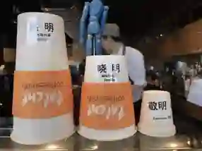 很显然,根据身高排序,分别代表都大中小三个杯型。很形象很犀利,看到的人,基本上都会拍照发朋友圈,给这家店铺带来了持续的关注和客源。