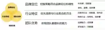 三个步骤中的第一步是:根据品牌定位调性、行业特点和团队特点3个角度,选择具体的挖掘策略。到底我们的产品和品牌更适合挖特性、数据、内容还是故事。