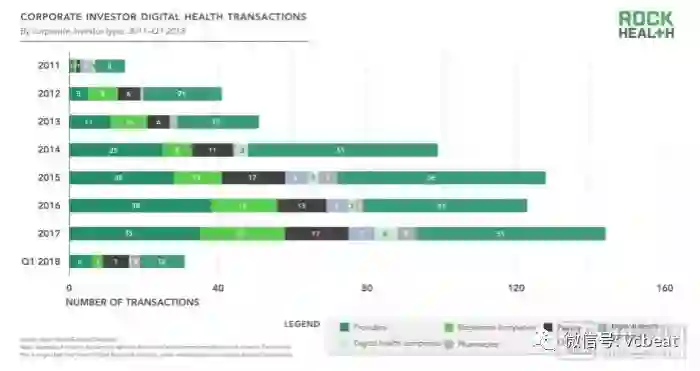 许多企业投资者被归类为“其他”,因为他们不属于传统的医疗护理公司类别。这些公司包括通用电气、亚马逊、百思买、苹果、百度等非传统企业,他们对数字医疗康初创企业表现出持续的兴趣,但通常是为了推进自己的医疗战略。