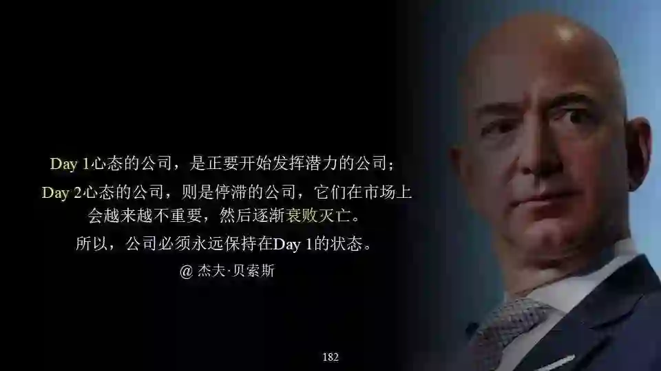 为了提醒自己,贝索斯把工作的大楼命名为 Day one,每天我进到这个楼的第一步,看到的是这是我贝索斯的第一天,这是亚马逊的第一天。
