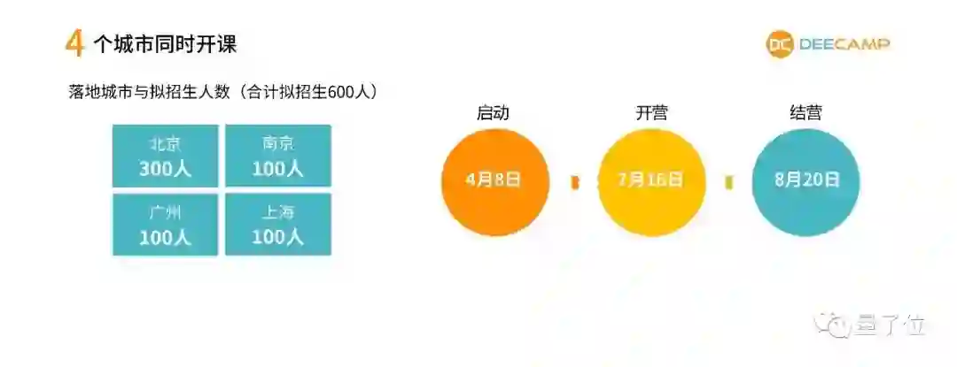 今年夏天的DeeCamp将会招收600名学生,分布在北京、南京、上海、广州四座城市,4月8日开始报名,整个训练营将于7月16日开始,8月20日结束,持续大约一个月的时间。