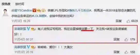 就在 IG 夺冠当日,《英雄联盟》官方微博就发布了庆祝 IG 夺冠给粉丝抽奖福利的活动。